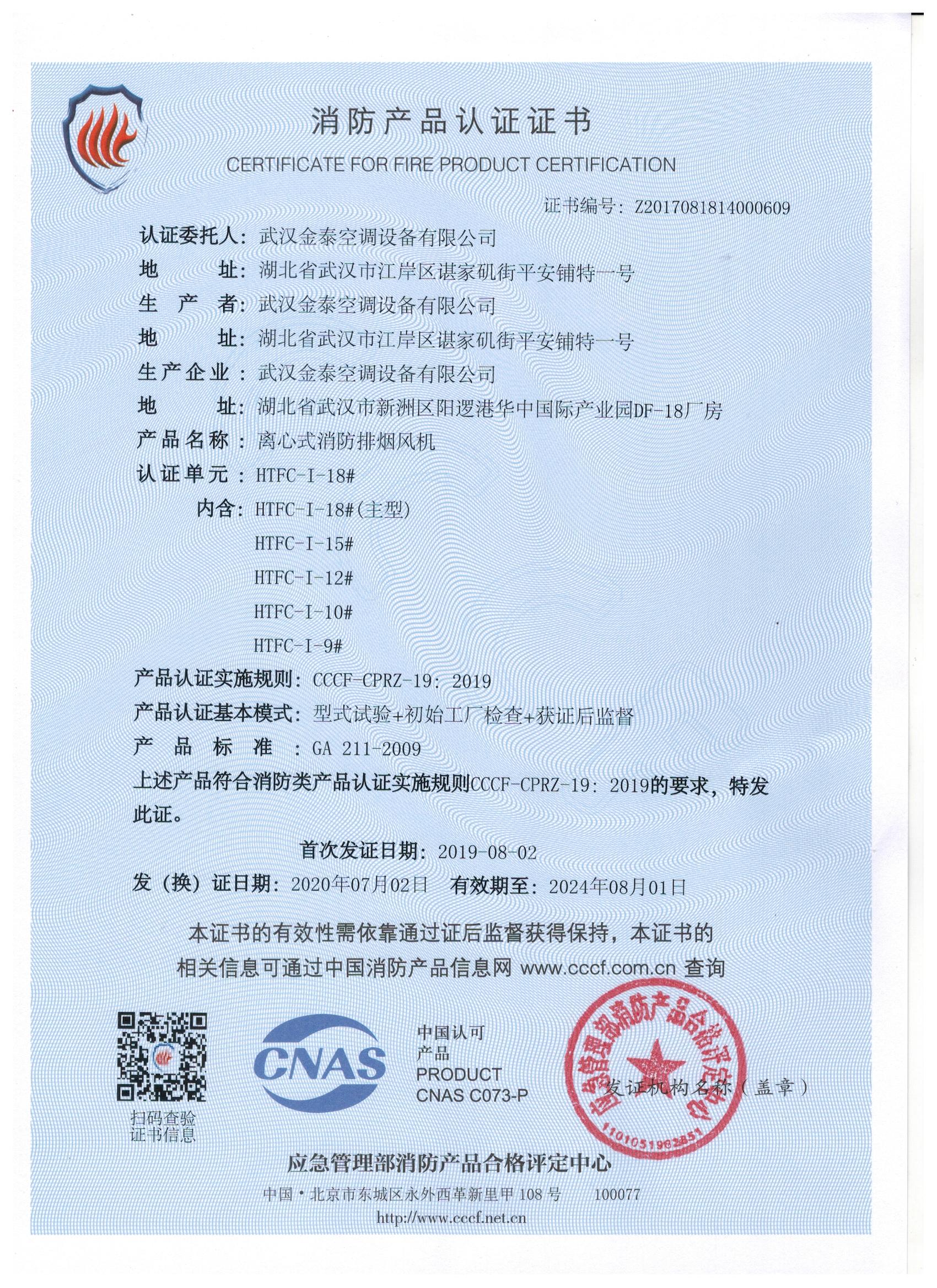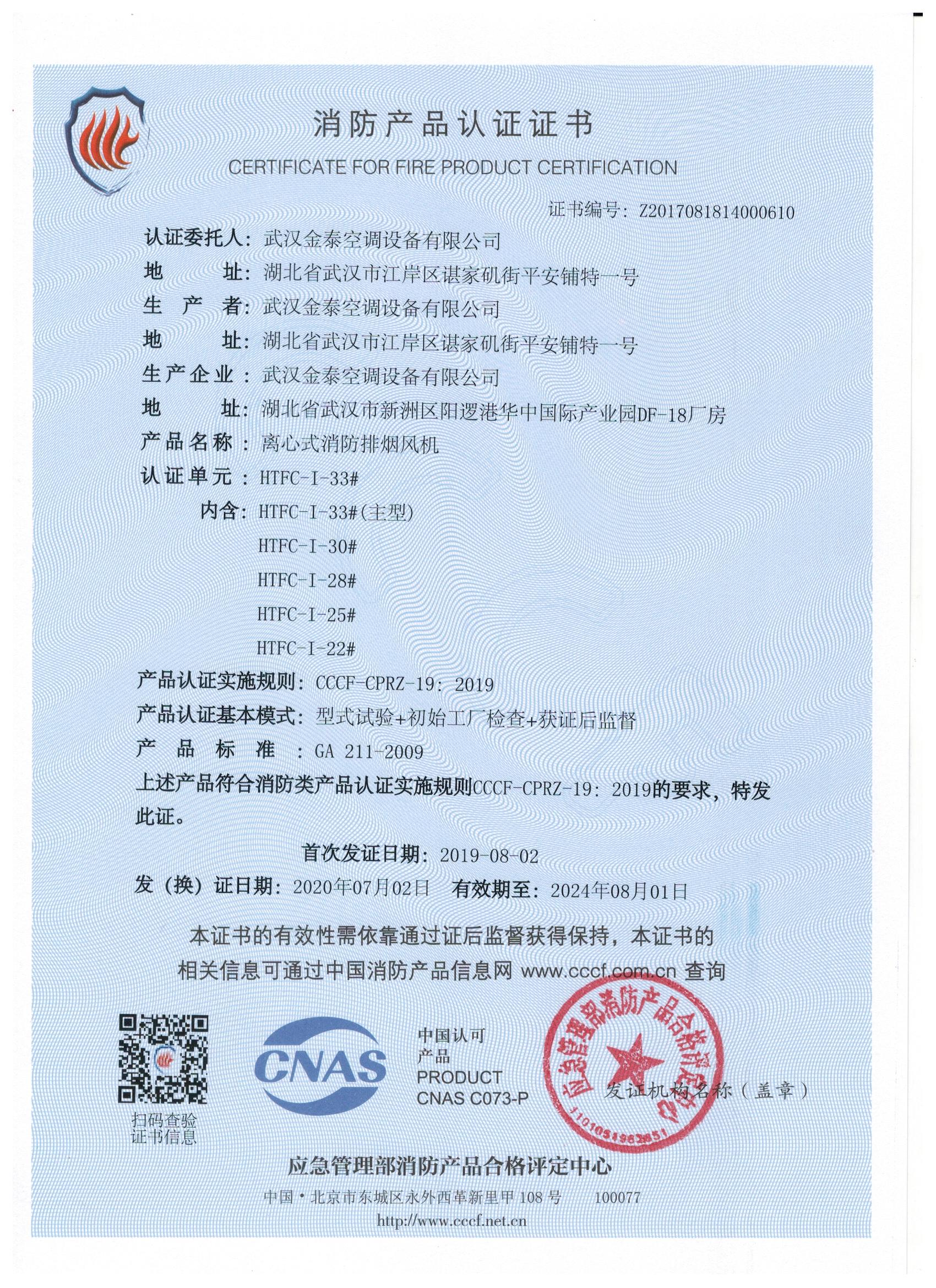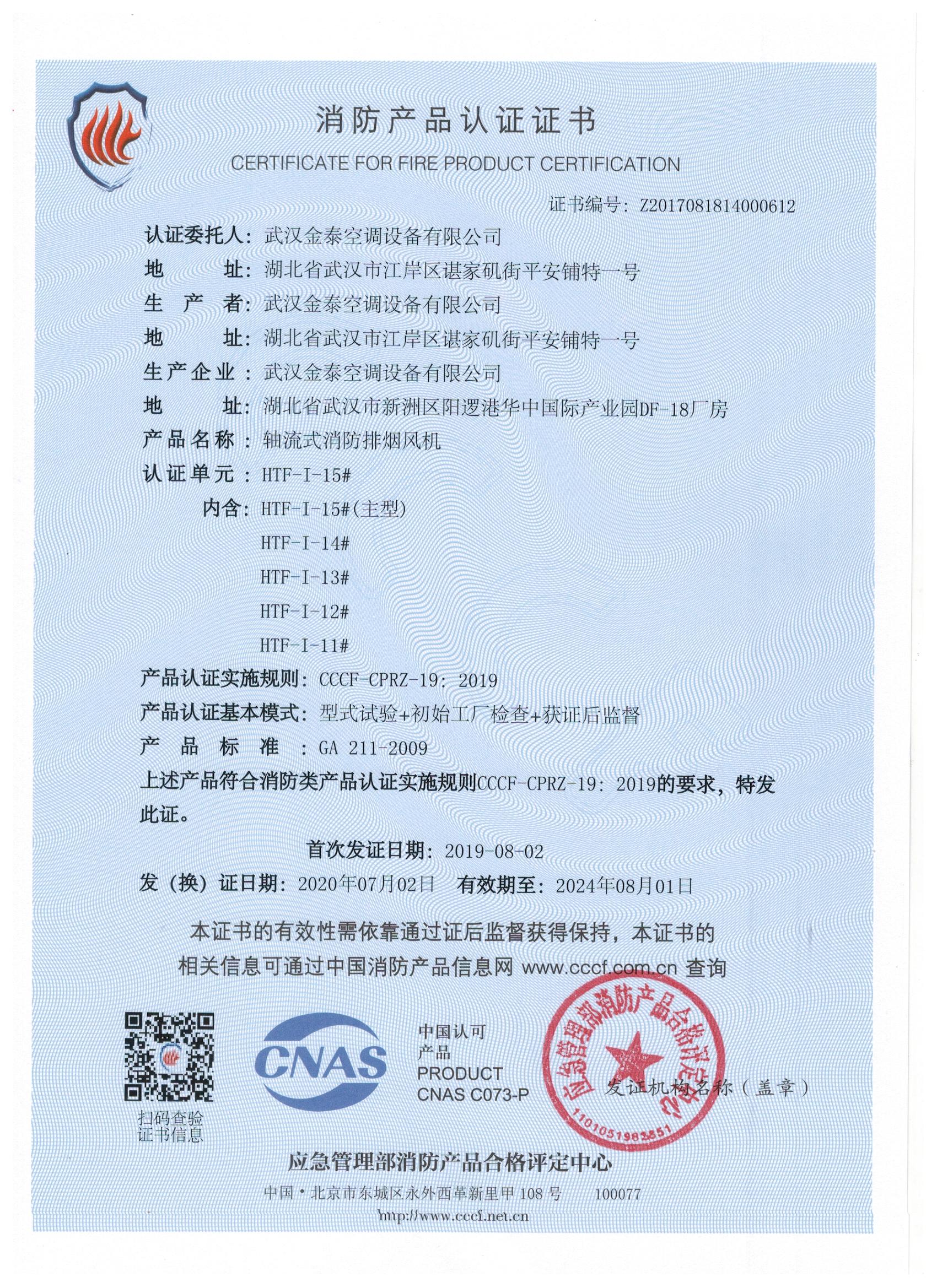 武漢金泰空調(diào)設(shè)備有限公司 是國(guó)內(nèi)長(zhǎng)期專注于民用風(fēng)機(jī)、工業(yè)風(fēng)機(jī)領(lǐng)域的標(biāo)桿企業(yè):專業(yè)生產(chǎn)消防排煙風(fēng)機(jī)系列、排煙防火閥系列、一般通風(fēng)機(jī)系列(軸流式、離心式、屋頂式、壁式、隧道式、射流式)、風(fēng)口、風(fēng)管等消防及通風(fēng)設(shè)備。產(chǎn)品經(jīng)公安部消防產(chǎn)品合格評(píng)定中心評(píng)定符合消防產(chǎn)品CCC標(biāo)準(zhǔn);經(jīng)中國(guó)合格評(píng)定國(guó)家認(rèn)可委員會(huì)認(rèn)證的檢驗(yàn)所檢驗(yàn)合格;經(jīng)國(guó)家防火建材質(zhì)量監(jiān)督檢驗(yàn)中心(四川中心)火燒實(shí)驗(yàn),耐火性能達(dá)標(biāo)。